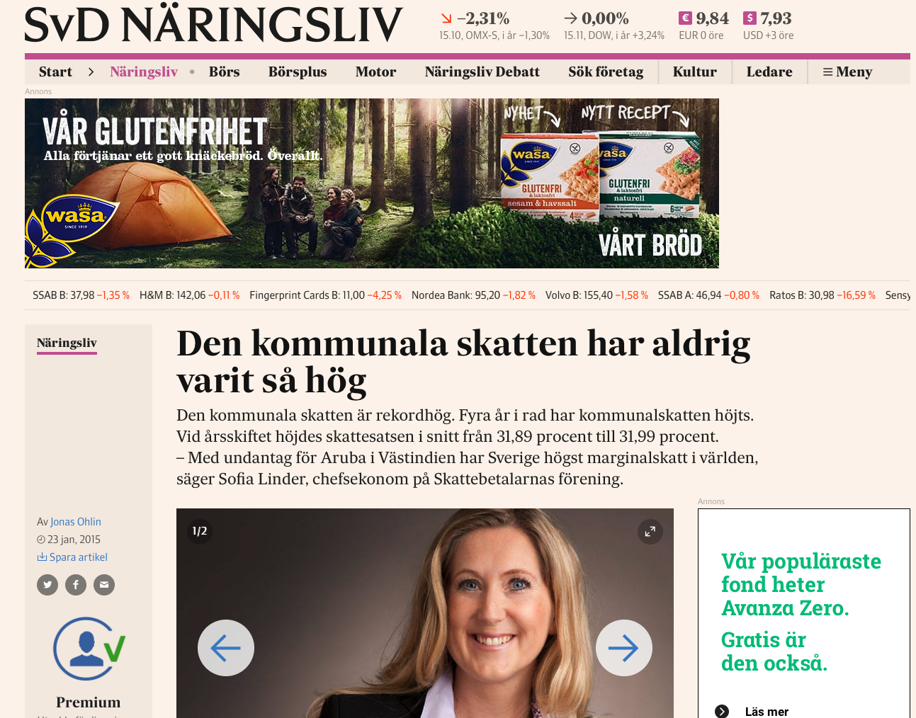 Med undantag för Aruba i Västindien har Sverige högst marginalskatt i världen och det är olyckligt att den fortsätter att stiga i år, säger Sofia Linder, chefsekonom på Skattebetalarna. Hon påpekar att höjd kommunalskatt påverkar marginalskatten, alltså skatten på den sist intjänade hundralappen. De med allra högst inkomst betalar 25 procent i statlig inkomstskatt och har alltså en marginalskatt på 56,99 procent 2015.