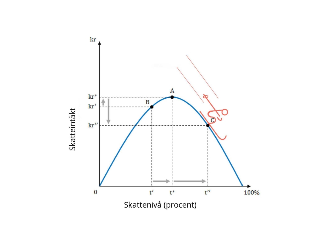 Lafferkurvan visar sambandet mellan skattesats och skatteintäkter. Skatteintäkterna ökar med en högre skattekvot, men bara till en viss nivå. Blir skatterna för höga minskar den beskattade aktiviteten, t ex arbete, varför skatteintäkterna minskar.